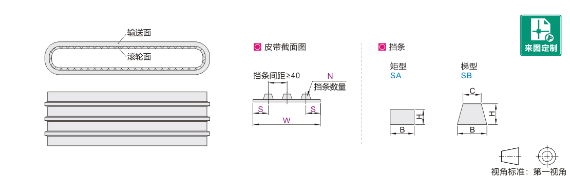 请指定可被档条安装间距整除的皮带宽度,无法整除时,档条均匀的热熔在皮带表面;