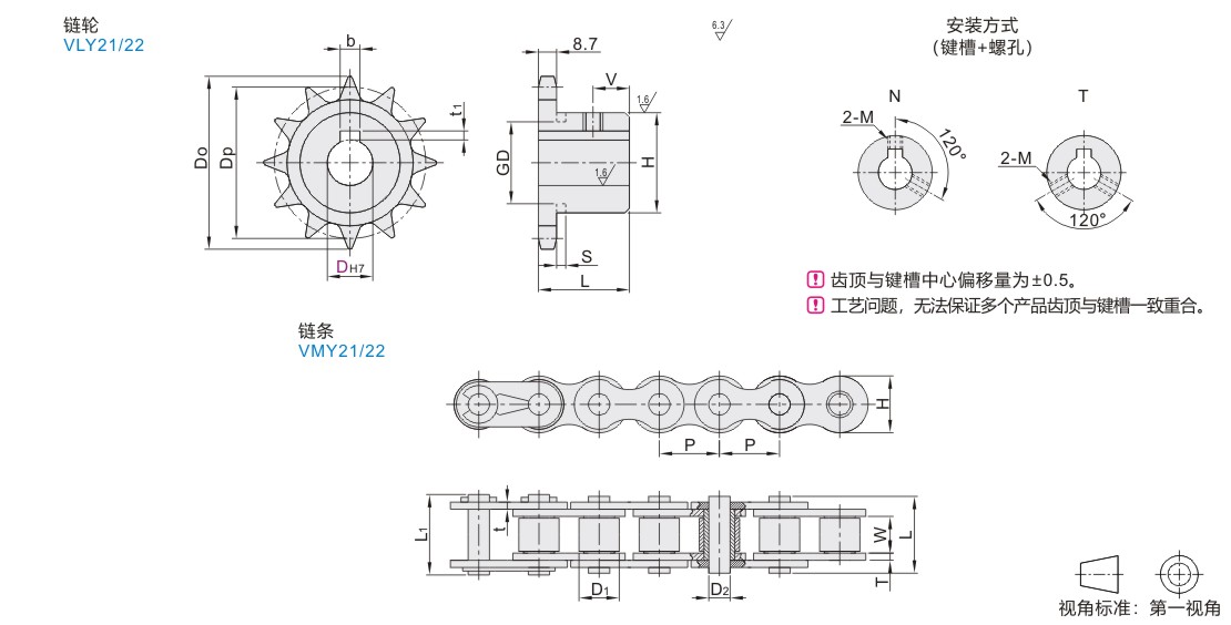 由于工艺和不同生产批次备库的原因,无法保证所有链轮键槽位置一致,因此当需要多个链轮同步使用的时候,您需要再下单时再型号后面备注工况,举例:VLD02-35-16-D14(键槽两两配对,链轮同步使用)
