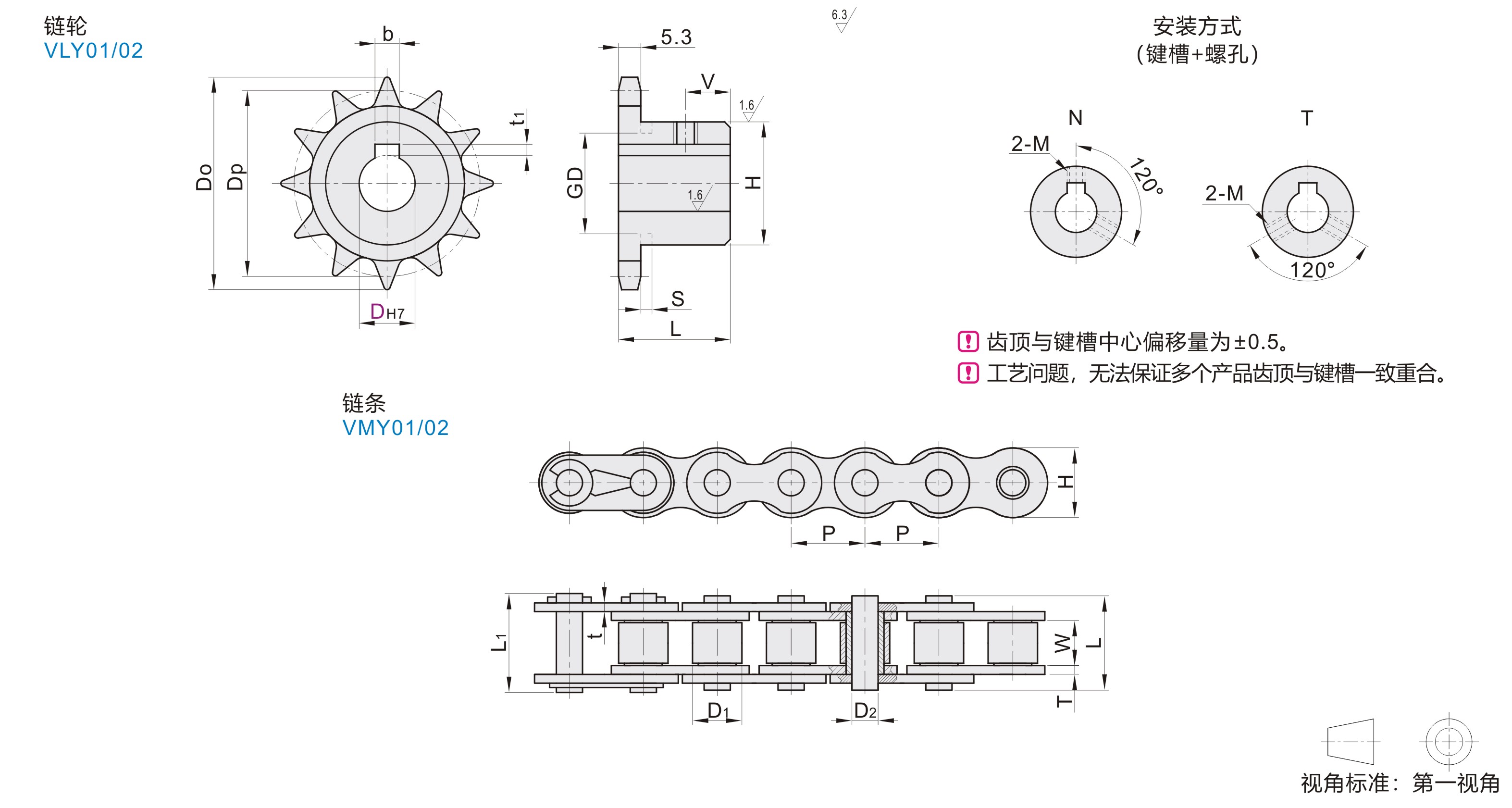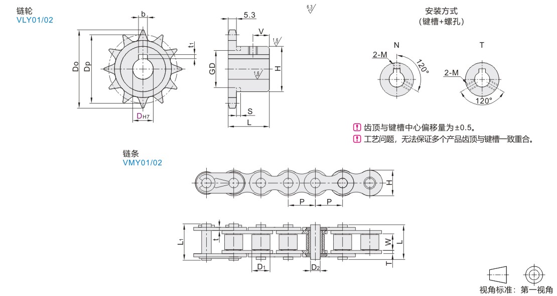 由于工艺和不同生产批次备库的原因,无法保证所有链轮键槽位置一致,因此当需要多个链轮同步使用的时候,您需要再下单时再型号后面备注工况,举例:VLD02-35-16-D14(键槽两两配对,链轮同步使用)