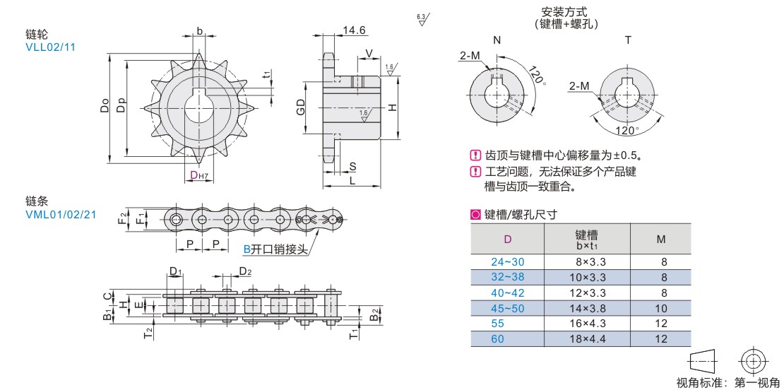 由于工艺和不同生产批次备库的原因,无法保证所有链轮键槽位置一致,因此当需要多个链轮同步使用的时候,您需要再下单时再型号后面备注工况,举例:VLD02-35-16-D14(键槽两两配对,链轮同步使用)