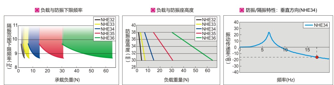 ● 根据负载与防振下限频率的曲线图,因10N·16.7Hz>10Hz,故使用型号为NHE34-30;