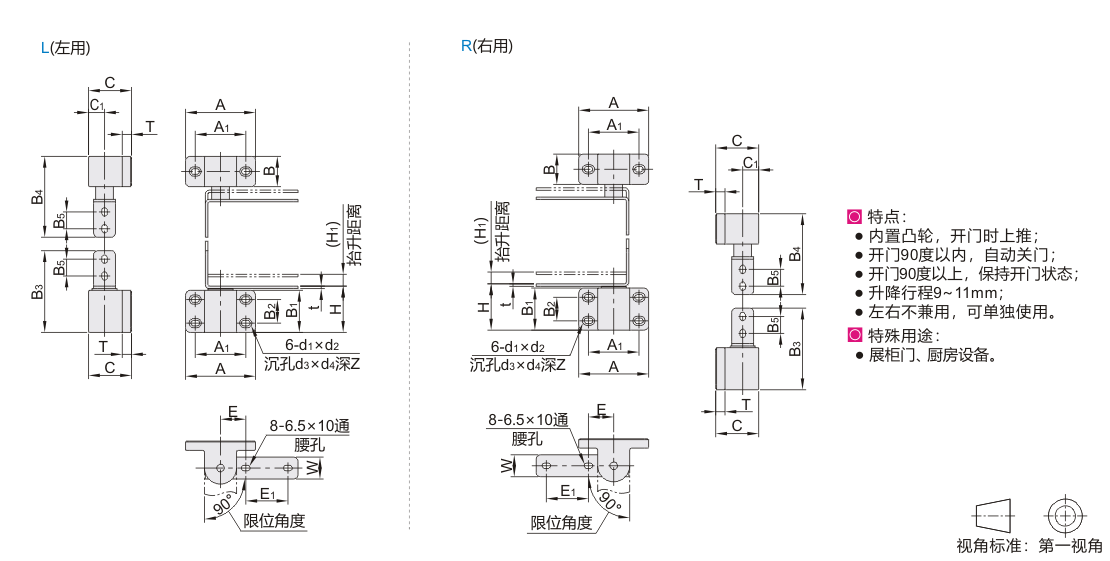 天地铰链 L型 展柜门 厨房设备用 升降型 门推转动型 安装左右侧 SUS304 滚筒抛光