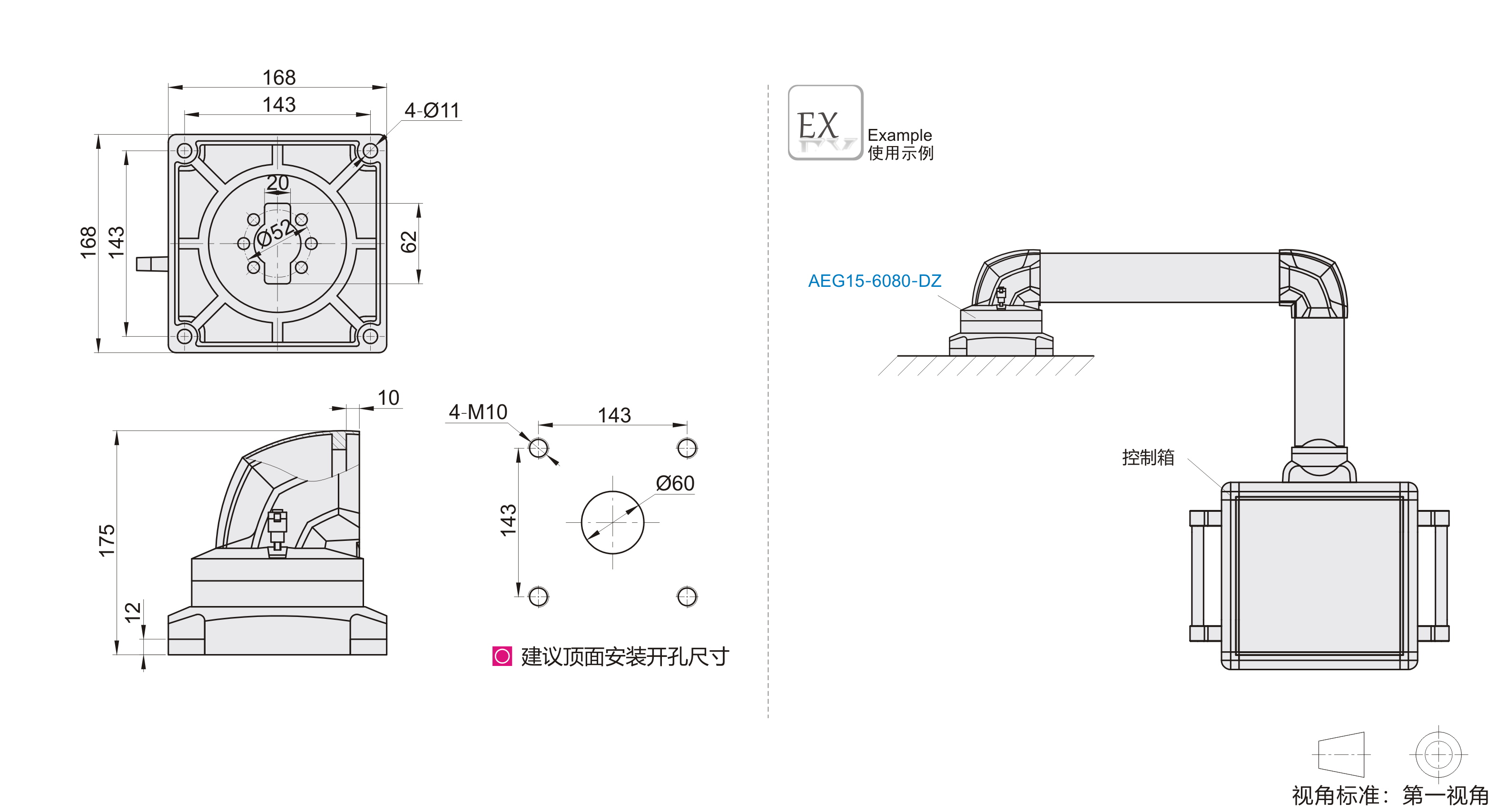 用途:用于顶面悬臂水平安装,可旋转0~320°。