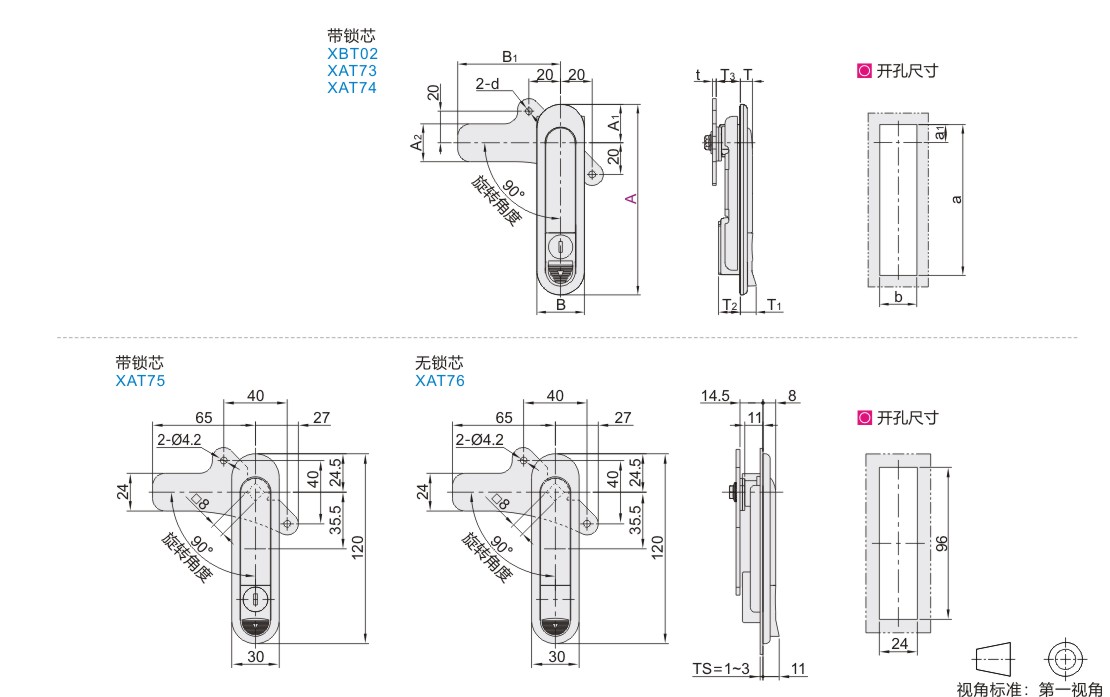 | 型号 | A1 | A2 | B | B1 | d | T | T1 | T2 | T3 | t | a | b | a1 | TS(适用 门板厚度) |