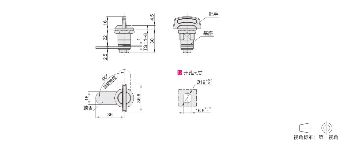 ● 锁舌旋转90°实现开启或锁闭功能;