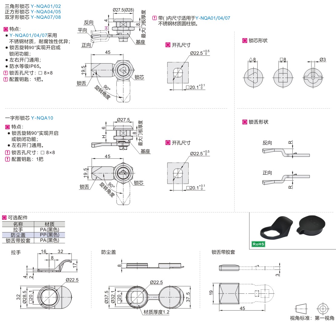 | Y-NQA01 | 20系列 | 10~44 | 三角形锁芯 | SUS304 | SUS304 | SUS304 | — | — | — |