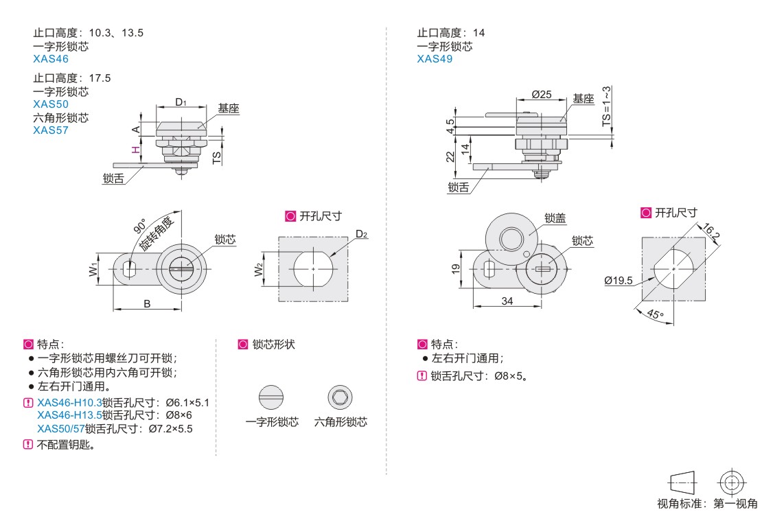 | XAS46 | 20系列 | 10.3/13.5 | 一字形锁芯 | ZDC | ZDC | Q235 | 镀亮铬 | 镀亮铬 | 镀锌 |