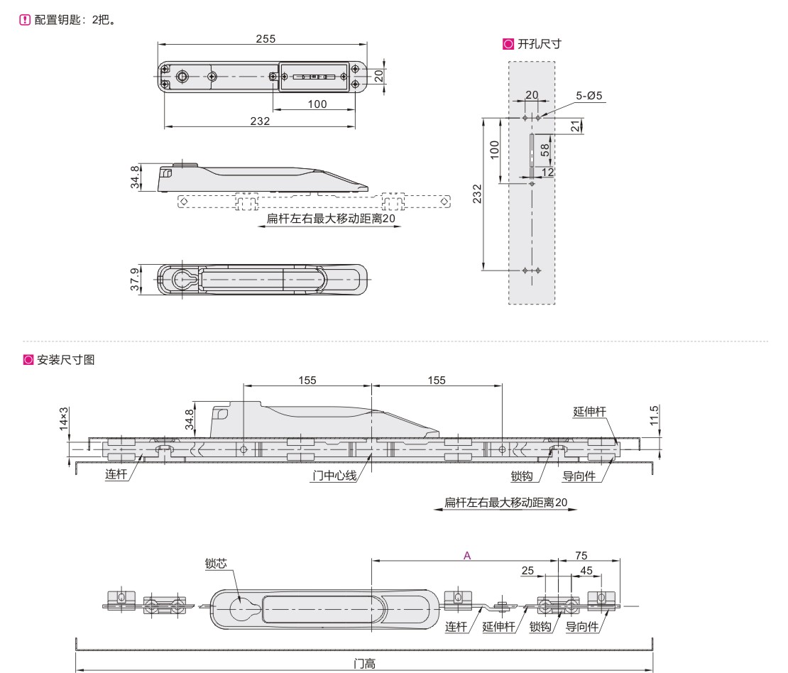连杆锁 把手按压转动式 圆形独立按钮 两点式