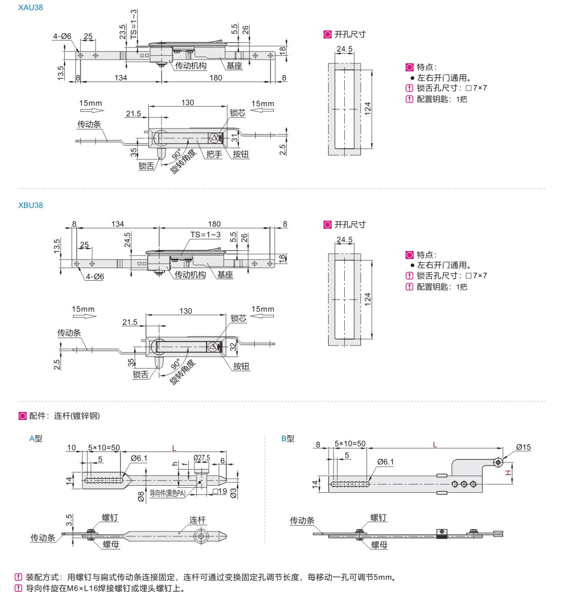 连杆锁 把手按压转动式 三点式 带锁芯 锁芯一体式按钮