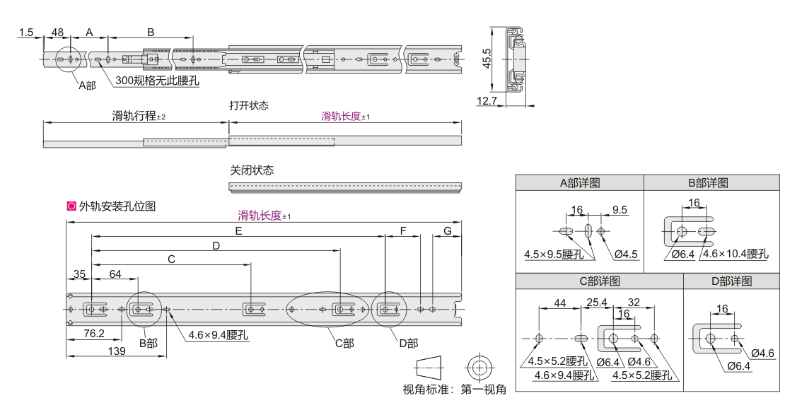 工业滑轨 45系列 三节式 闭合保持 内轨可抽出 SPCC