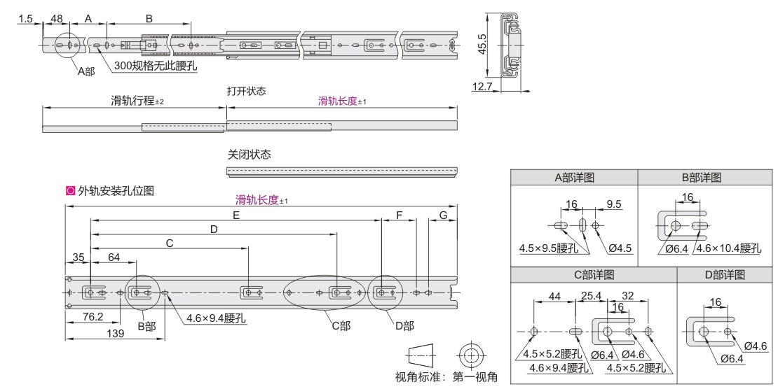 医疗工业滑轨 45系列 三节式 闭合保持 内轨可抽出 SPCC