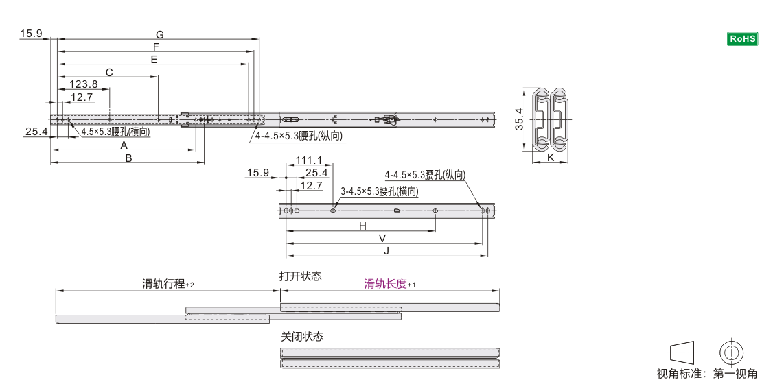 在内轨和外轨的安装孔中,自两端起第1、2个孔为纵向腰孔,其余为横向腰孔。