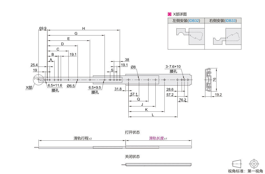 | IDB32 | 三节式 | 打开/闭合锁定内轨不可抽出 | 76 | 左侧安装 | SPCC | 环保镀锌 (蓝白) |