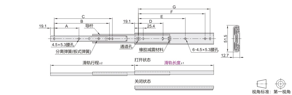 | 型号 | 滑轨行程 | A | B | C | D | E | F | G | 承重(1副) | 重量 (kg/pcs) |