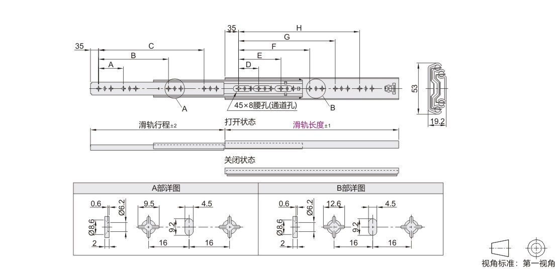 医疗工业滑轨 53系列 三节式 闭合保持 内轨可抽出 SPCC