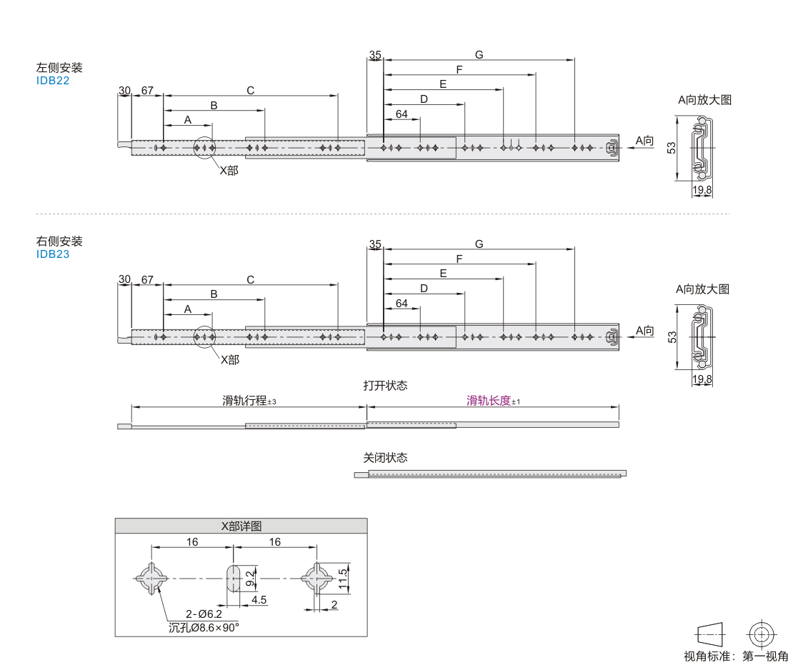 | IDB22 | 三节式 | 打开/闭合锁定内轨可抽出 | 53 | 左侧安装 | SPCC | 环保镀锌(蓝白) |