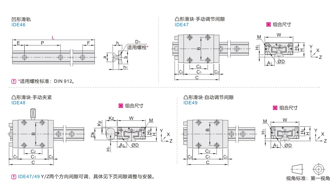| IDE46 | 间隙可调 | 凹形滑轨 | — | AlMgSi0.5 | 本色硬质阳极氧化 | |