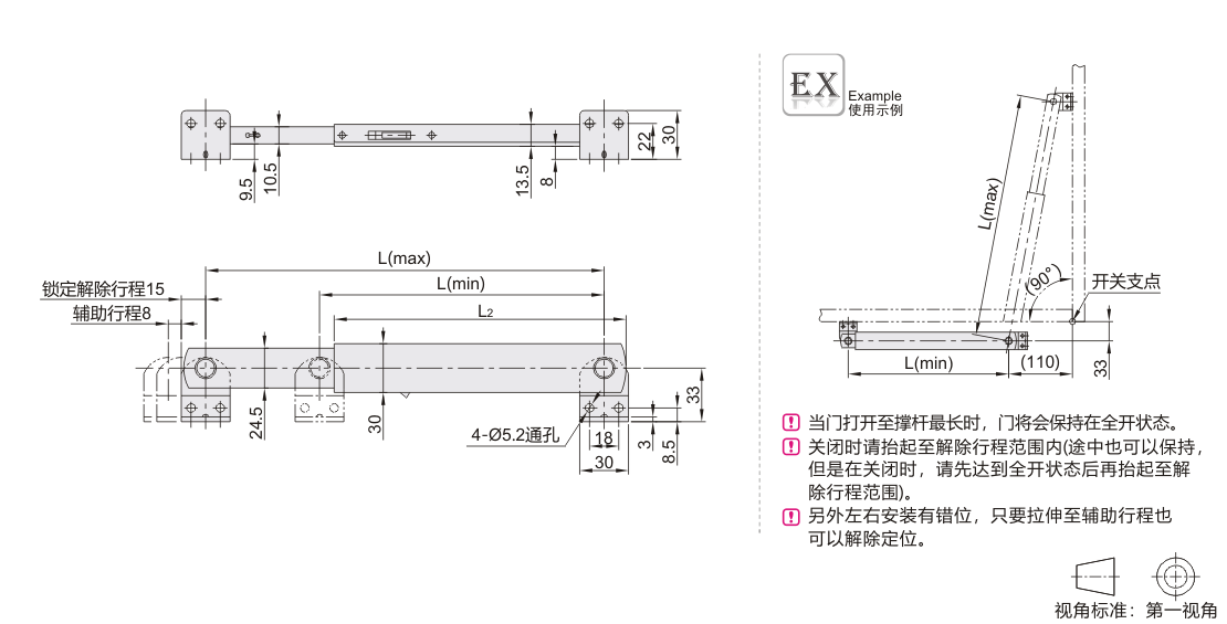 多级锁定型伸缩撑杆 带安全锁机构 重型门用 SUS304 表面拉丝 两点固定