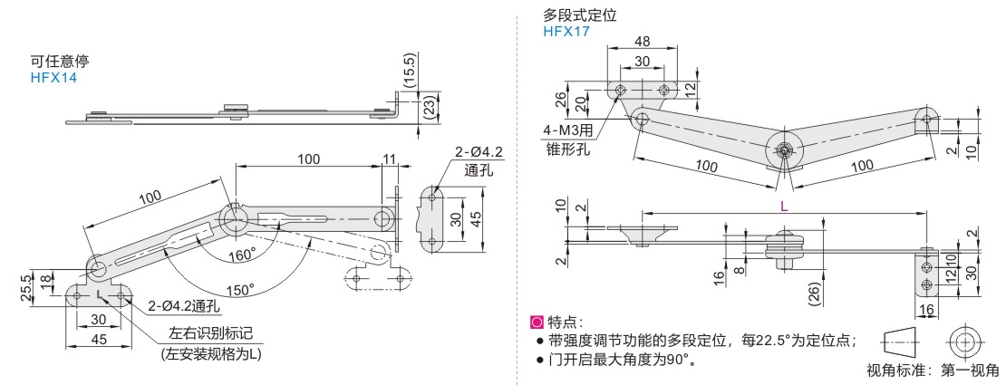 | HFX14 | 两点固定 | 可任意停 | SUS430 | 滚筒抛光 |