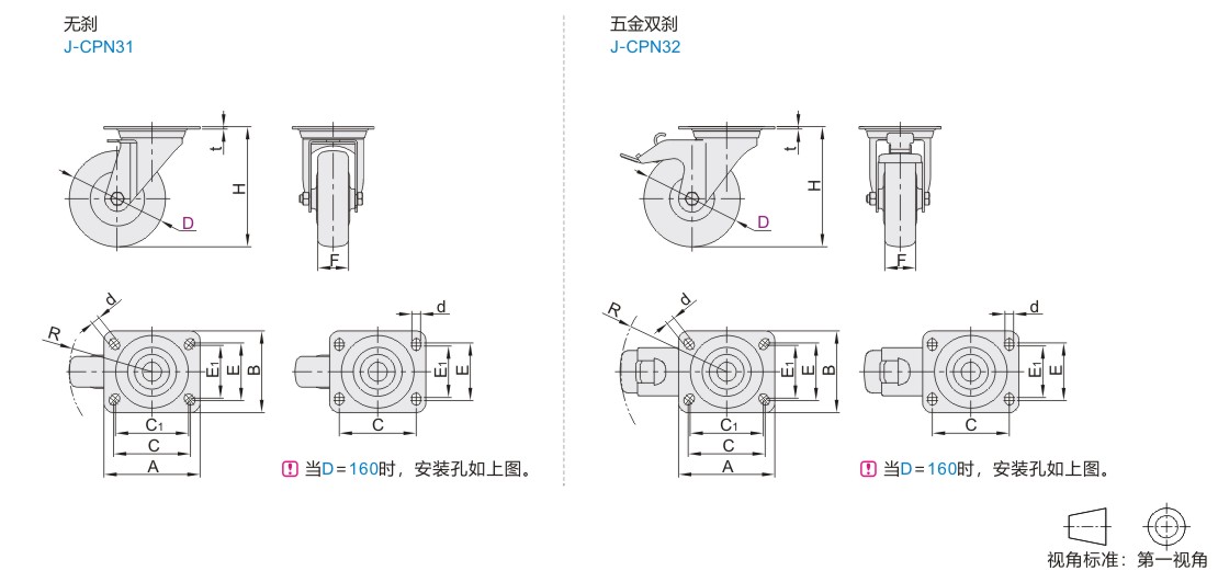 德国系列中型脚轮 容许载荷150-300kg 平底活动型