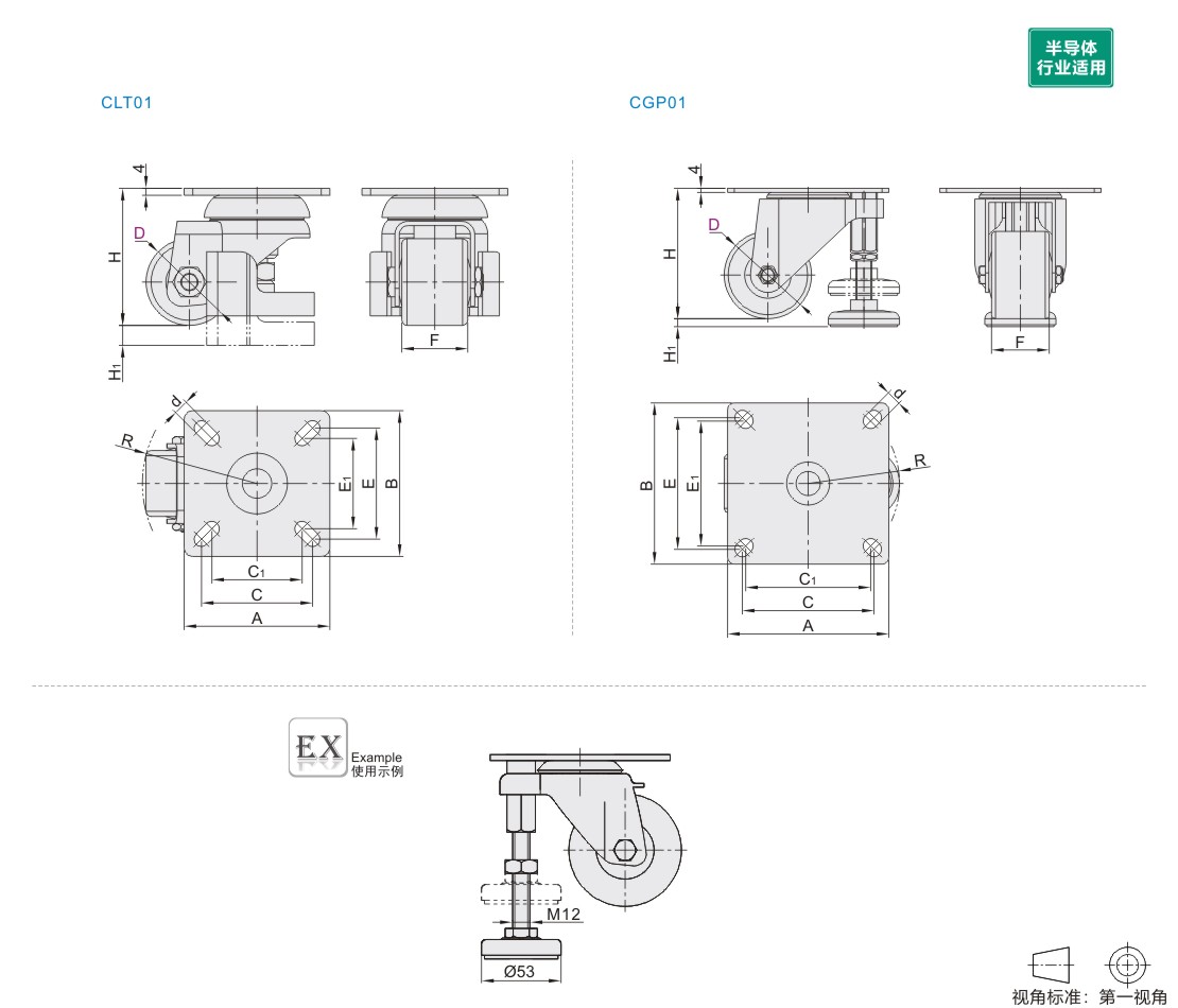 常规水平调节脚轮 容许载荷150-200kg 平底活动型 带偏心调整块