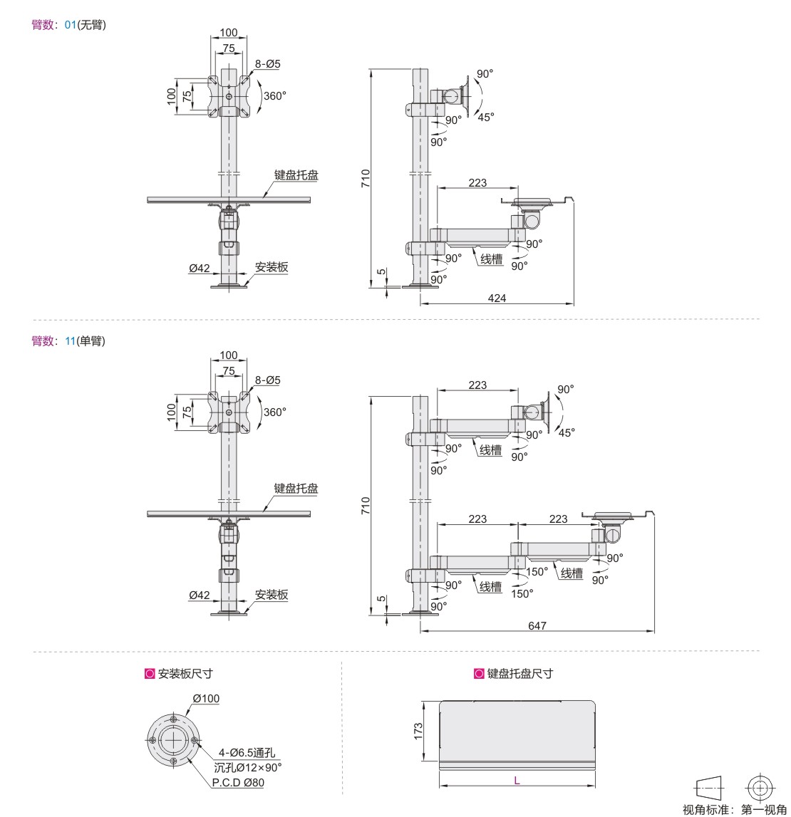 经济型显示器支架 通用键盘 单显示器 立式/吊顶安装 立柱锁紧•普通型•无臂/单臂