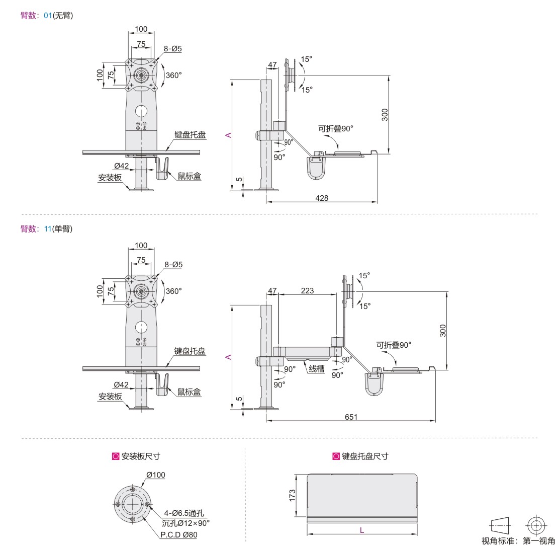 经济型显示器支架 通用键盘 单显示器 立式/吊顶安装 固定型•普通型•无臂/单臂