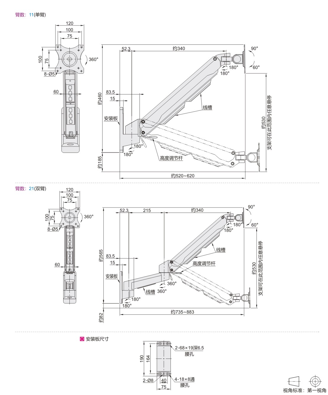 重载型显示器支架 无键盘 壁挂式安装 气弹簧锁定型•臂长405mm