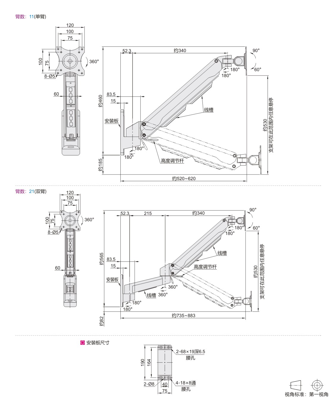 重载型显示器支架 无键盘 壁挂式安装 气弹簧锁定型•臂长405mm