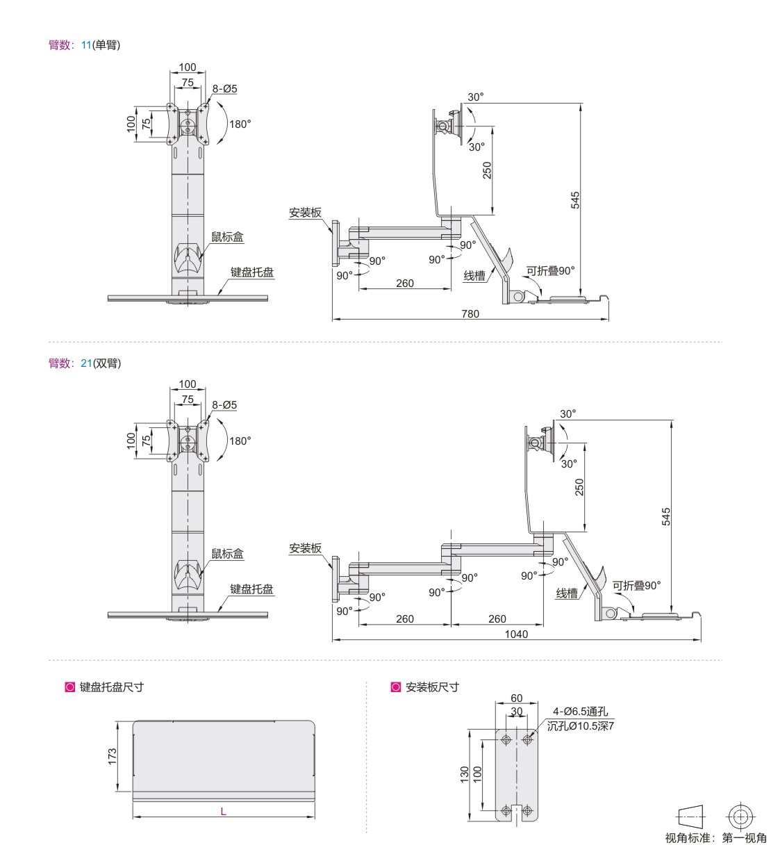 重载显示器支架 无键盘 单显示器 壁挂式安装 普通型 固定型 平均臂长260mm