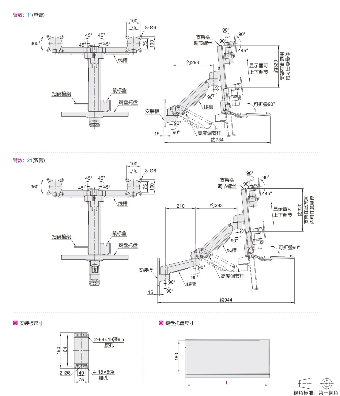 重载型显示器支架 通用键盘 双显示器 壁挂式安装 轴连接•气弹簧锁定型