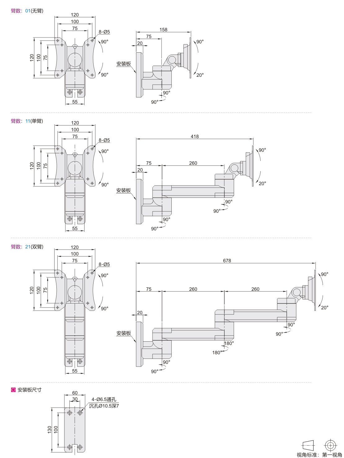 显示器支架 重载型 无键盘 平均臂长260mm 普通型 壁挂式安装 铝合金 灰白色