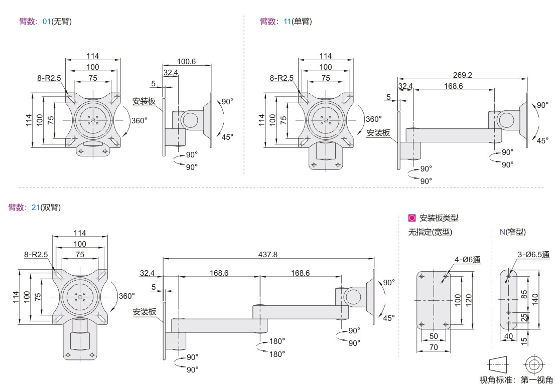怡合达经济型显示器支架 无键盘 单显示器 壁挂式安装 平均臂长170mm 轴连接 普通型 无臂/单臂/双臂 铝合金