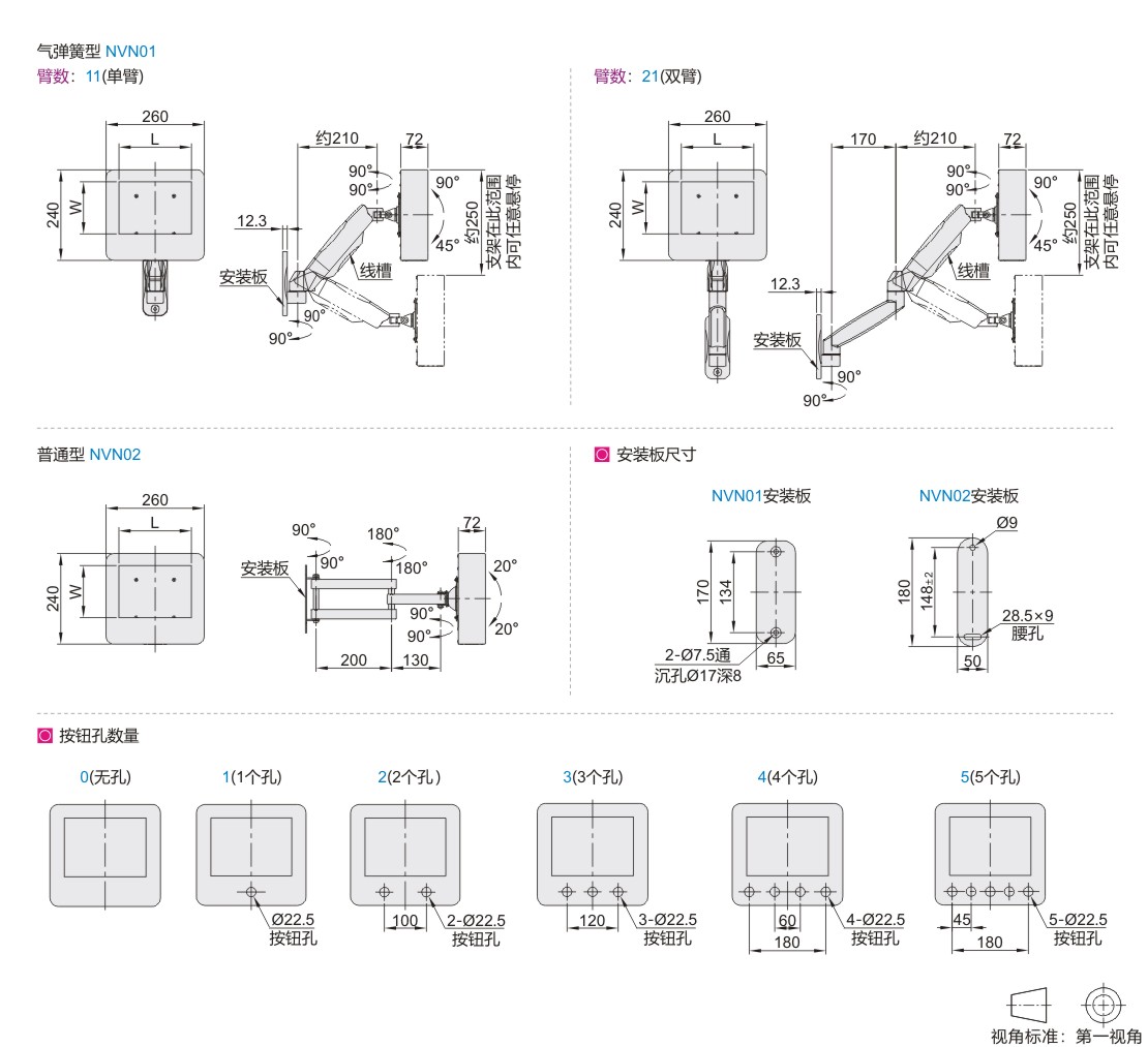 | NVN01 | 壁挂式安装 | 气弹簧型 | 7寸 | 下方 | 铝合金 | Q235+ABS塑料 |