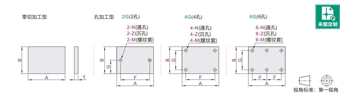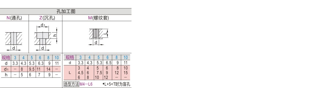 选择孔加工型时 ,请在N(通孔)、Z(沉孔)、M(螺纹套)+L(插入长度)三种型式中任选其一。