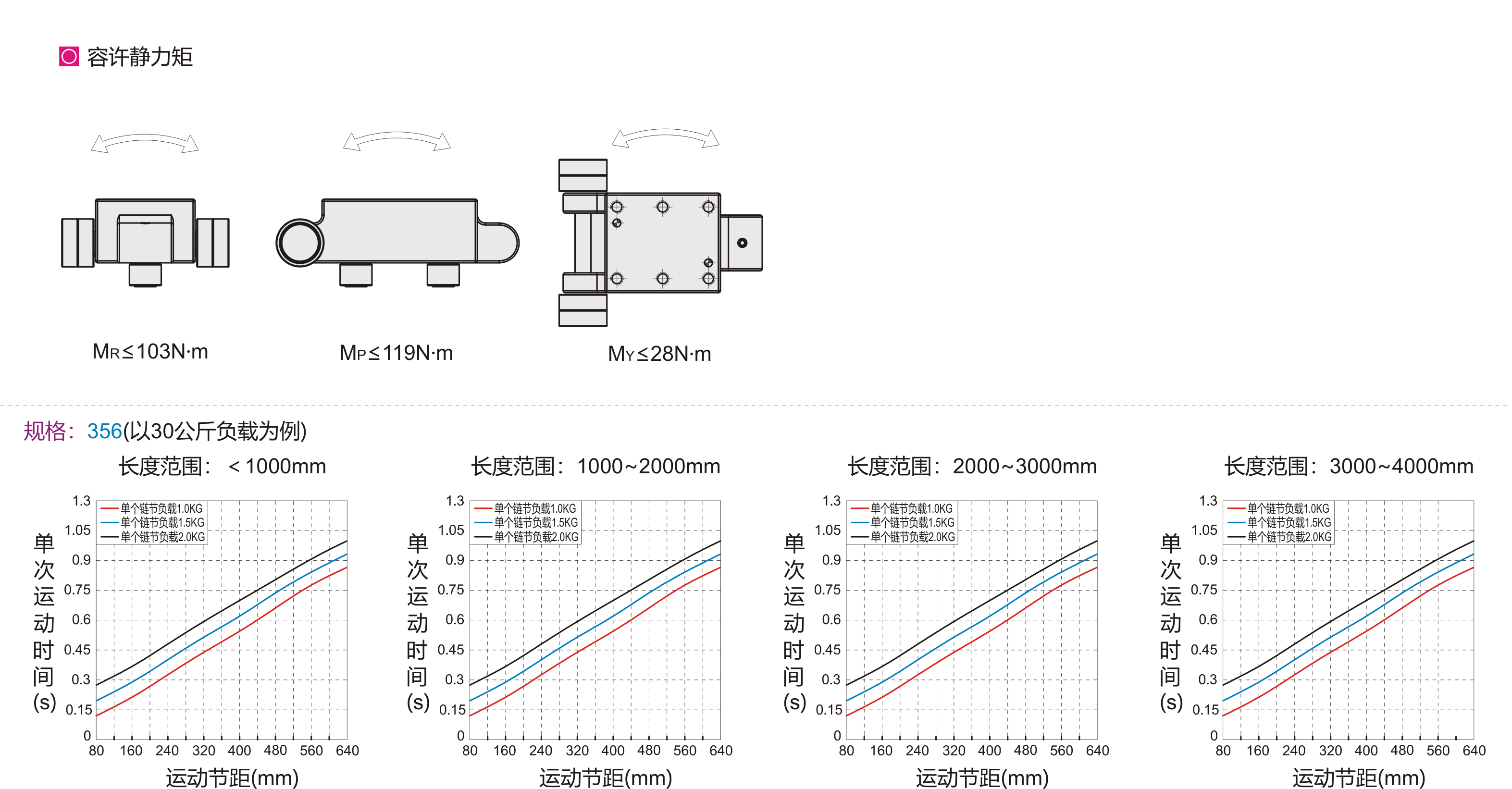 < 800mm/s | < 60kg | 组件长2640mm时,总重量 ≈380kg。 每增加480mm长度,重量增加大约45kg。 |