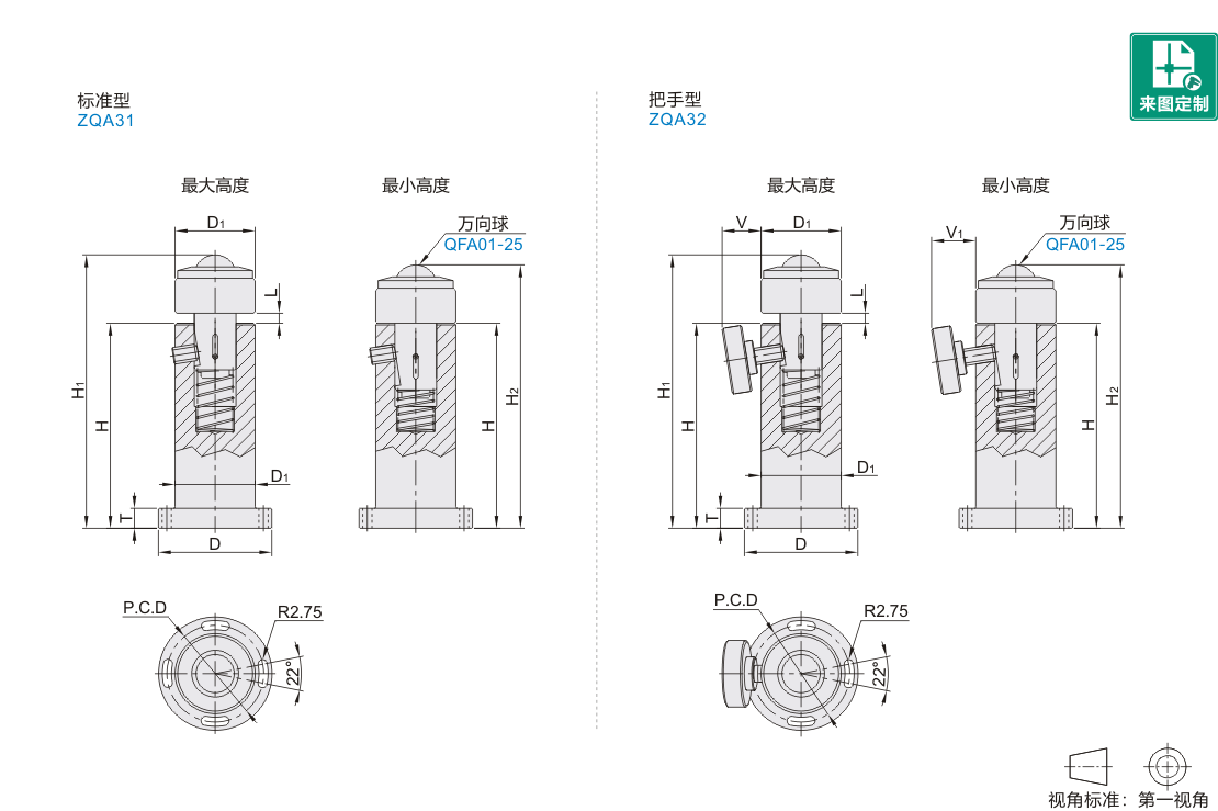| 型号 | H | 最大高度H1 | 最小高度H2 | D | D1 | P.C.D | T | V | V1 | 可活动最大活动 行程L |