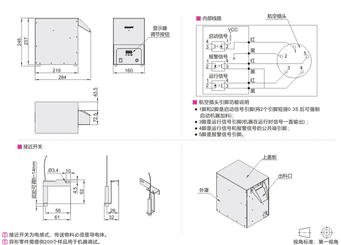 ● 该产品采用斜推板推送物料 ,为自动送料系统持续供料 。接近开关用于监测下一工序储料仓内物料数量,