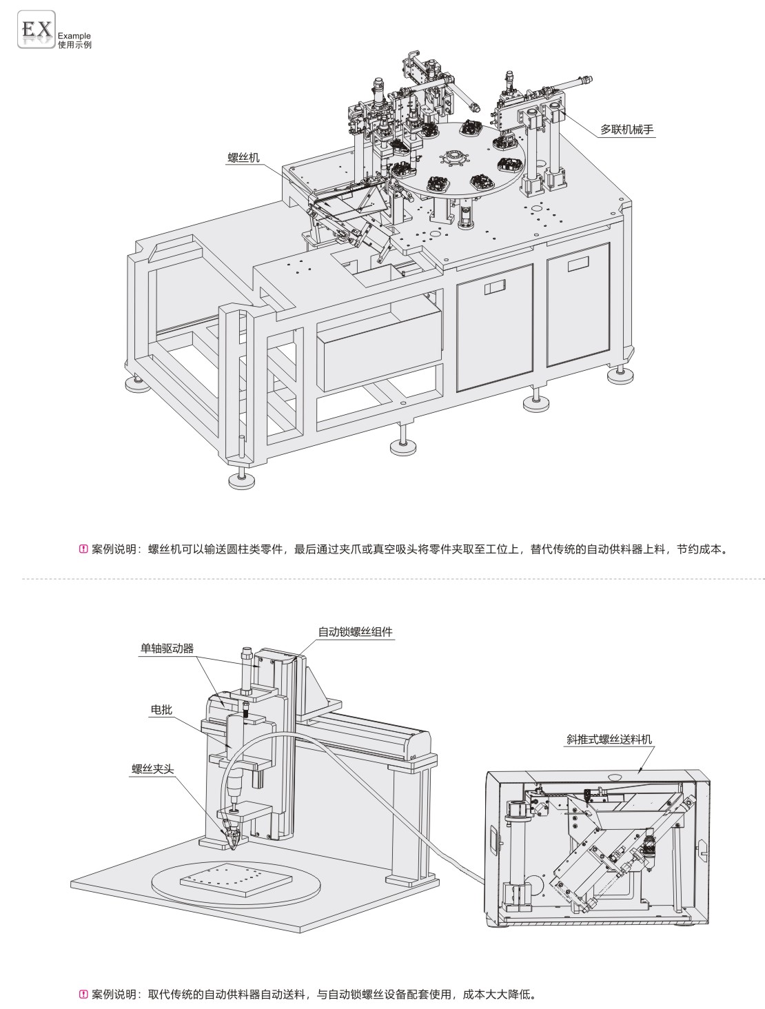 取代传统的振动盘自动送料,与自动锁螺丝设备配套使用。
