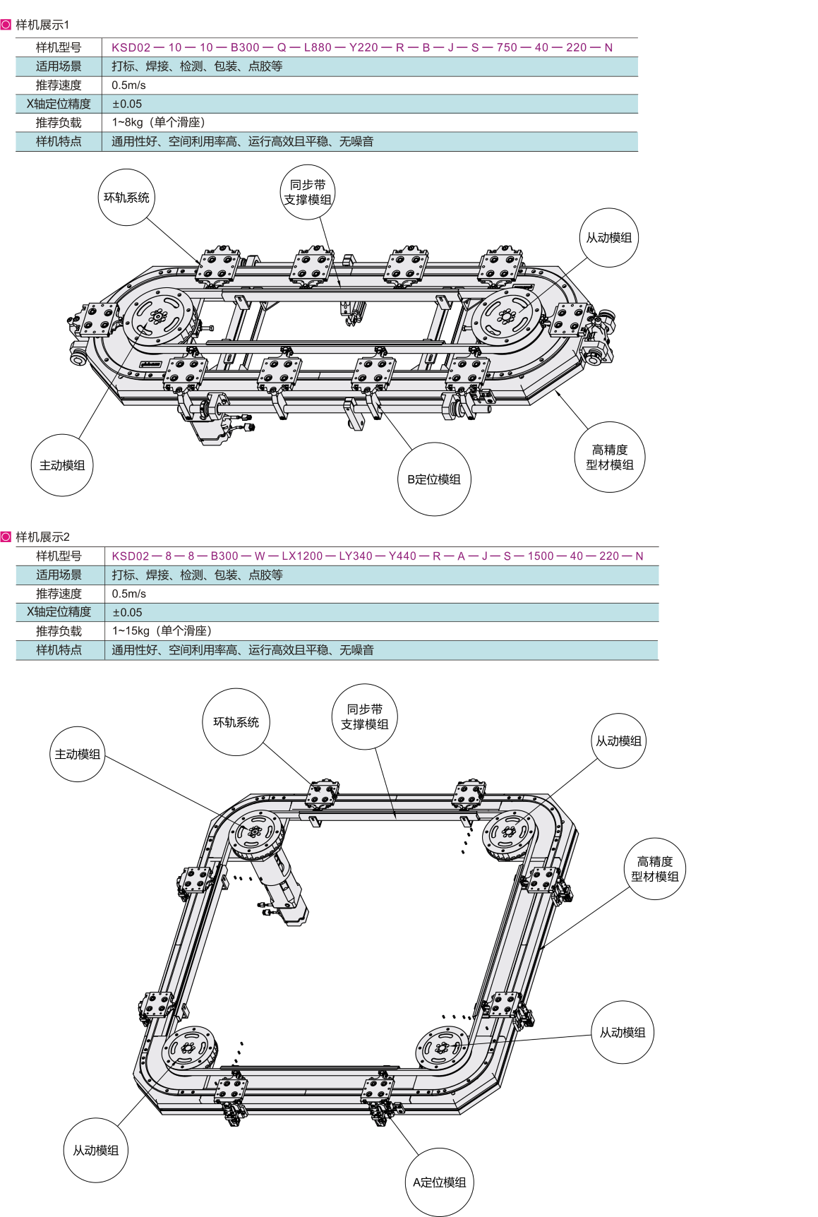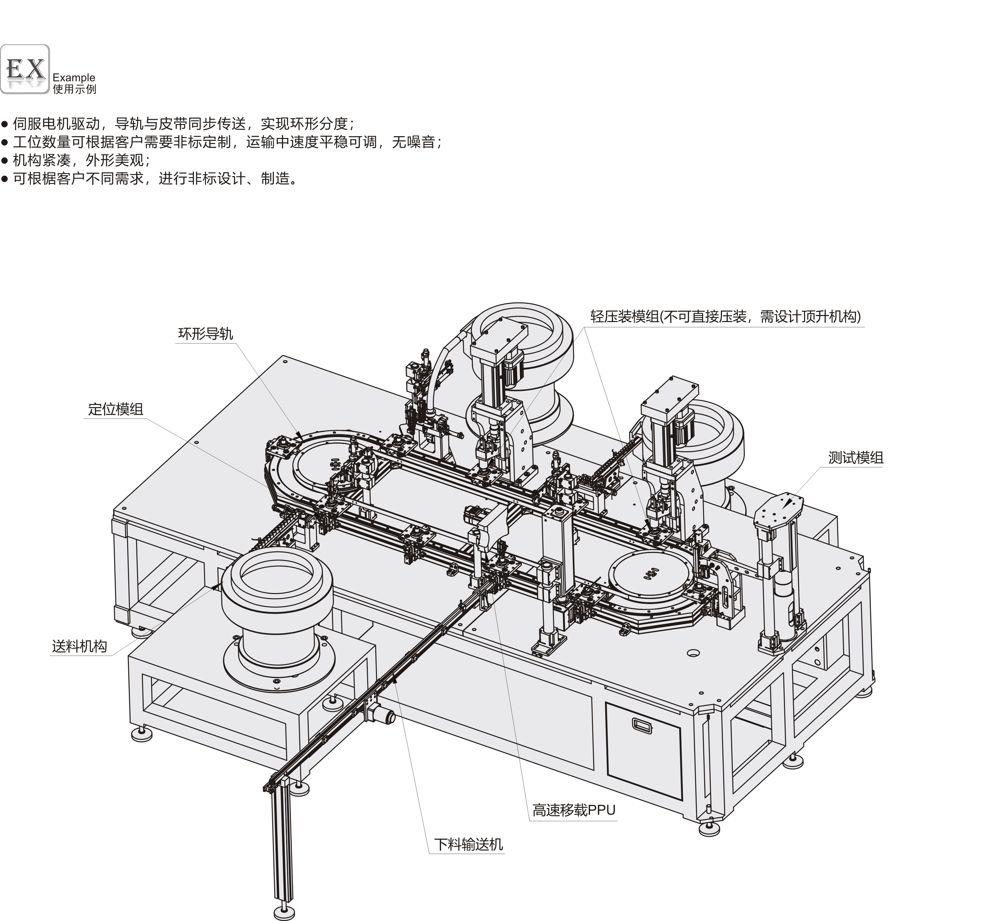 ● 多用于中小型的装配检测自动化设备,实现产品在工位与工位之间的高速传送;