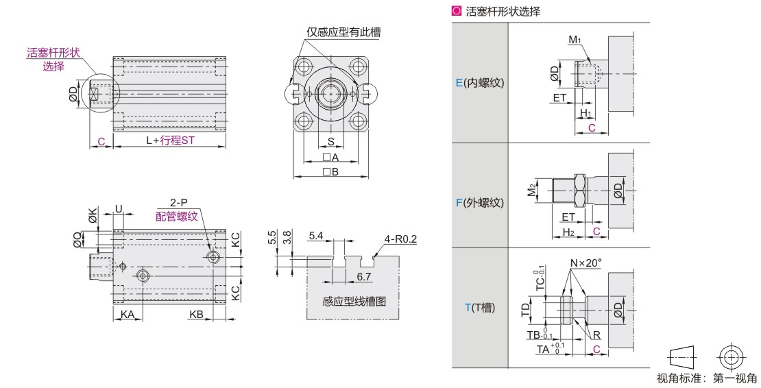 | 缸径 | D | B | L | Q | K | U | A | P | KA | KB | KC | E(内)/F(外) | E(内螺纹) | F(外螺纹) | T(T槽) | ||||||||||||