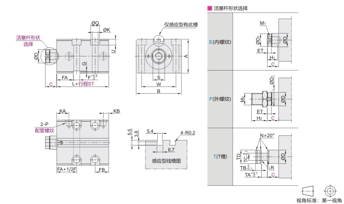 | 缸径 | D | B | A | L | W | Q | K | U | G | P | KB | KA | FB | F | FA | ST1*1 | E(内)/F(外) | E(内螺纹) | F(外螺纹) | T(T槽) | |||||||||||