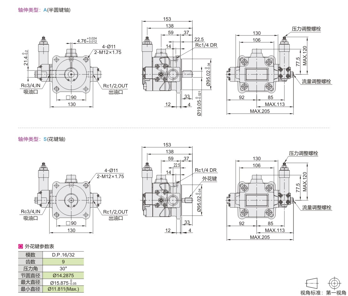 叶片泵 中压变量泵 半圆键/花键轴 最高工作压力14