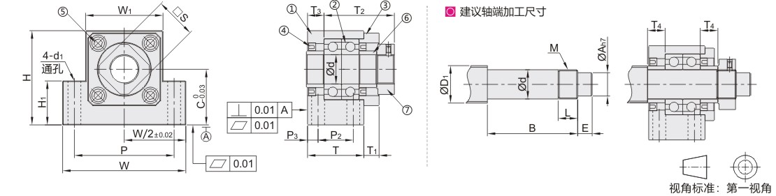 方形丝杠支座组件 窄孔距安装型 固定侧 精密型 标准型