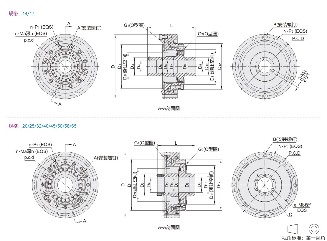 | 规格 | Dh7 | D1H7 | D2 | D3h7 | D4H7 | D5j6 | D6 | D7 | D8j6 | D9H7 | D10f7 | D11 | D12h6 | G1 | G2 |