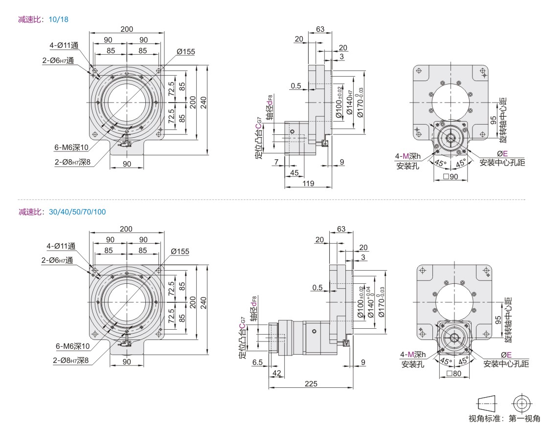减速比30~100为中空旋转平台本体+行星减速机组件合。