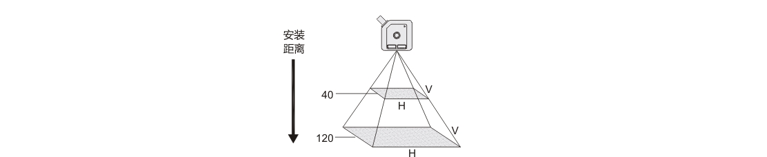 | 安装距离(mm) | 横向视野H(mm) | 纵向视野V(mm) | 1D最小分辨率(mm) | 2D最小分辨率(mm) |