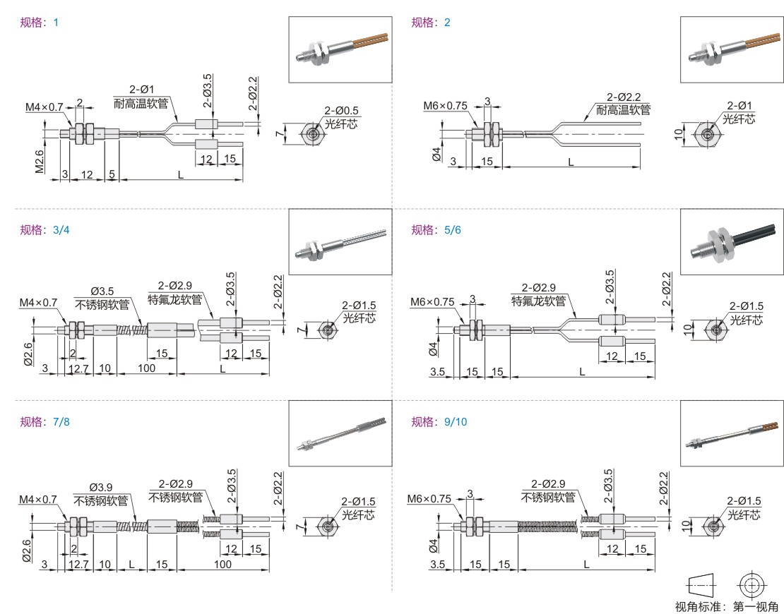 ● 对射式光纤包含两条光纤,一条发射器一条接收器,尺寸对称所以尺寸图仅展示一条的尺寸。