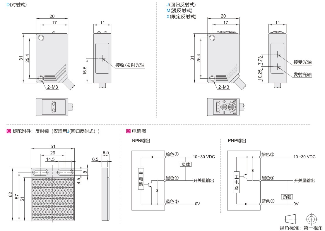 | 检测方式 | D(对射式) | J(回归反射式) | M(漫反射式) | X(限定反射式) |