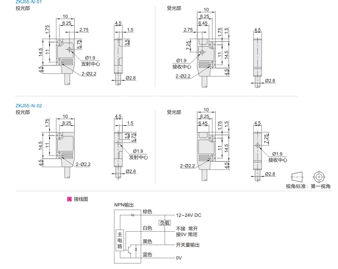 | ZKJ55 | N(NPN) | 01(正面检测) | 10~150 | 2米 | 4芯 Ø2.8电缆 |